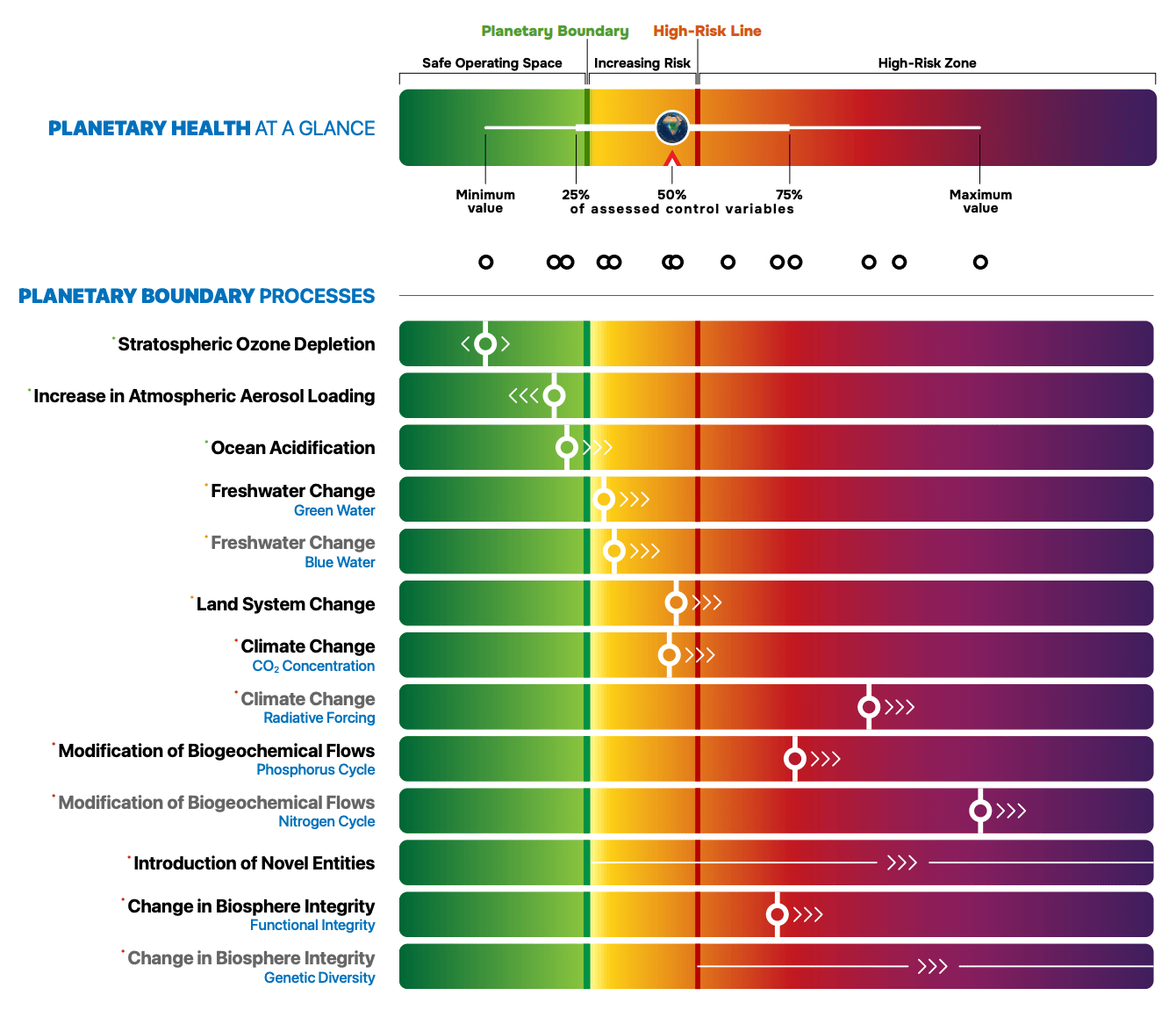Klimawandel, Artensterben, gestörte Stickstoff- und Phosphorkreisläufe, Landnutzungsänderungen, Süßwassermangel und die Belastung durch neuartige Stoffe wie Mikroplastik. Besonders kritisch ist, dass drei der überschrittenen Bereiche (Klimawandel, Biosphäre, biogeochemische Kreisläufe) bereits im Hochrisikobereich liegen.